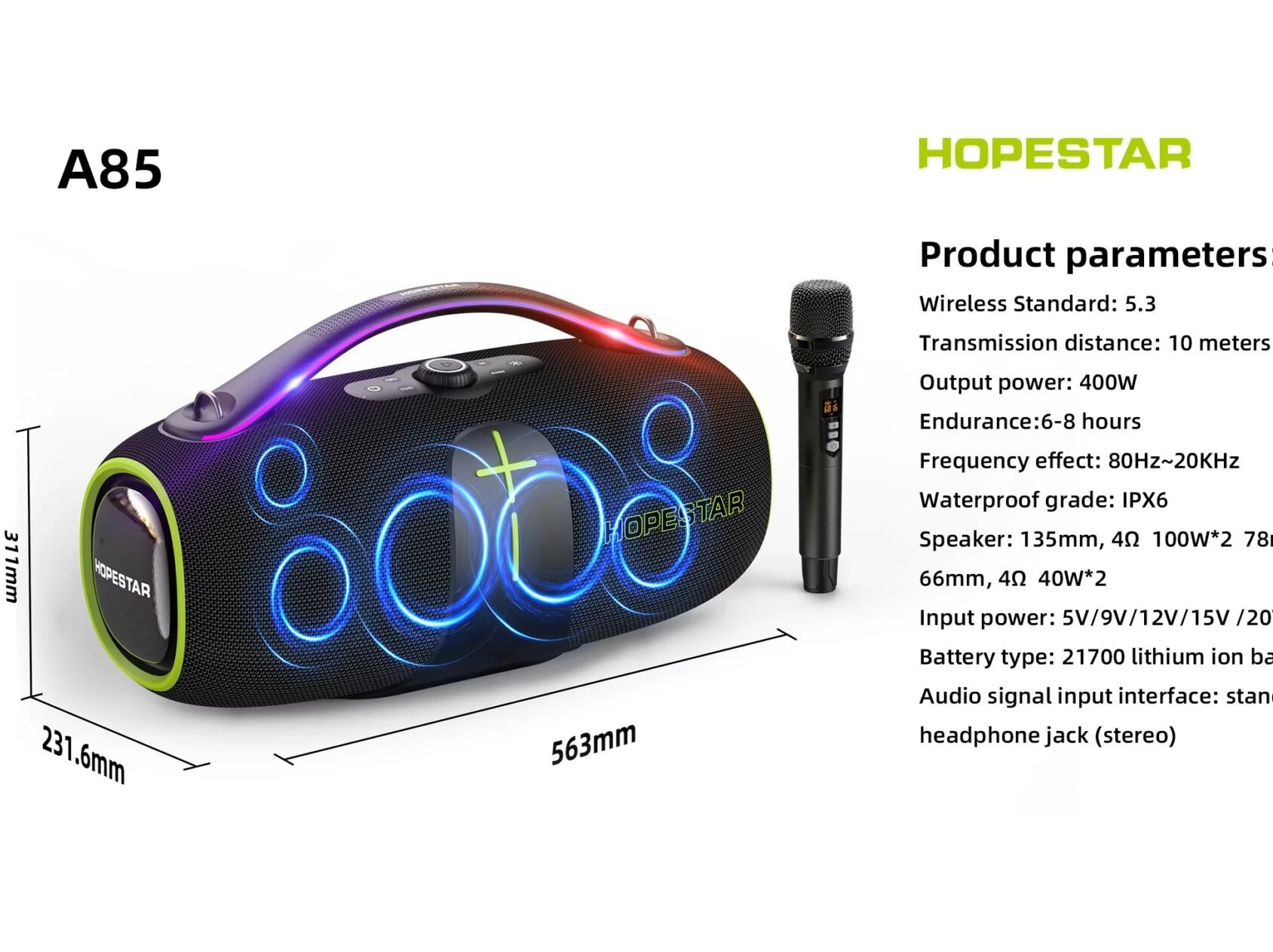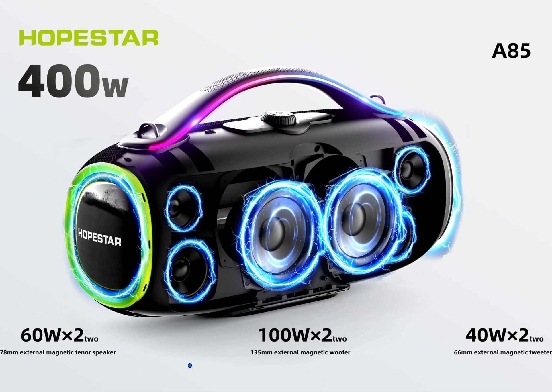 اسپیکر بلوتوثی Hopestar A85 یک غول صوتی همهکاره است که برای برپایی مهمانیهای پرشور و ایجاد تجربه سینمایی در فضای باز طراحی شده است. این مدل با ترکیب قدرت صوتی بسیار بالا، قابلیت ضدآب عالی و سیستم نورپردازی جذاب، انتخابی ایدهآل برای تبدیل هر جمعی به یک رویداد بهیادماندنی است.