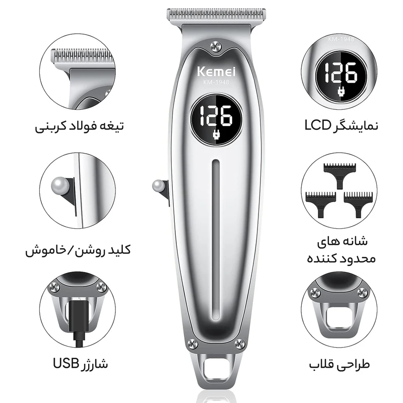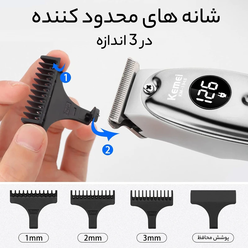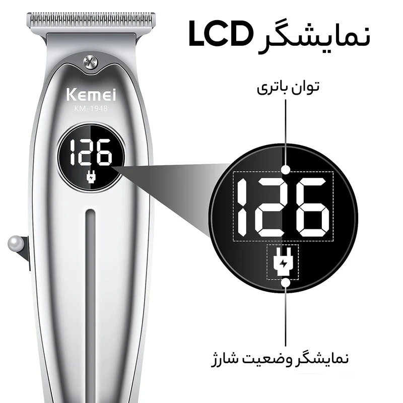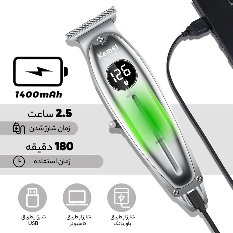 🔋 باتری با دوام و عملکرد بیسیم: ماشین اصلاح KM-1948 مجهز به یک باتری لیتیومی قابل شارژ با ظرفیت ۱۴۰۰ میلیآمپر ساعت است. این باتری پس از شارژ کامل، امکان ۱۲۰ تا ۱۸۰ دقیقه استفاده مداوم را فراهم میکند و شارژ آن از طریق پورت USB انجام میشود.