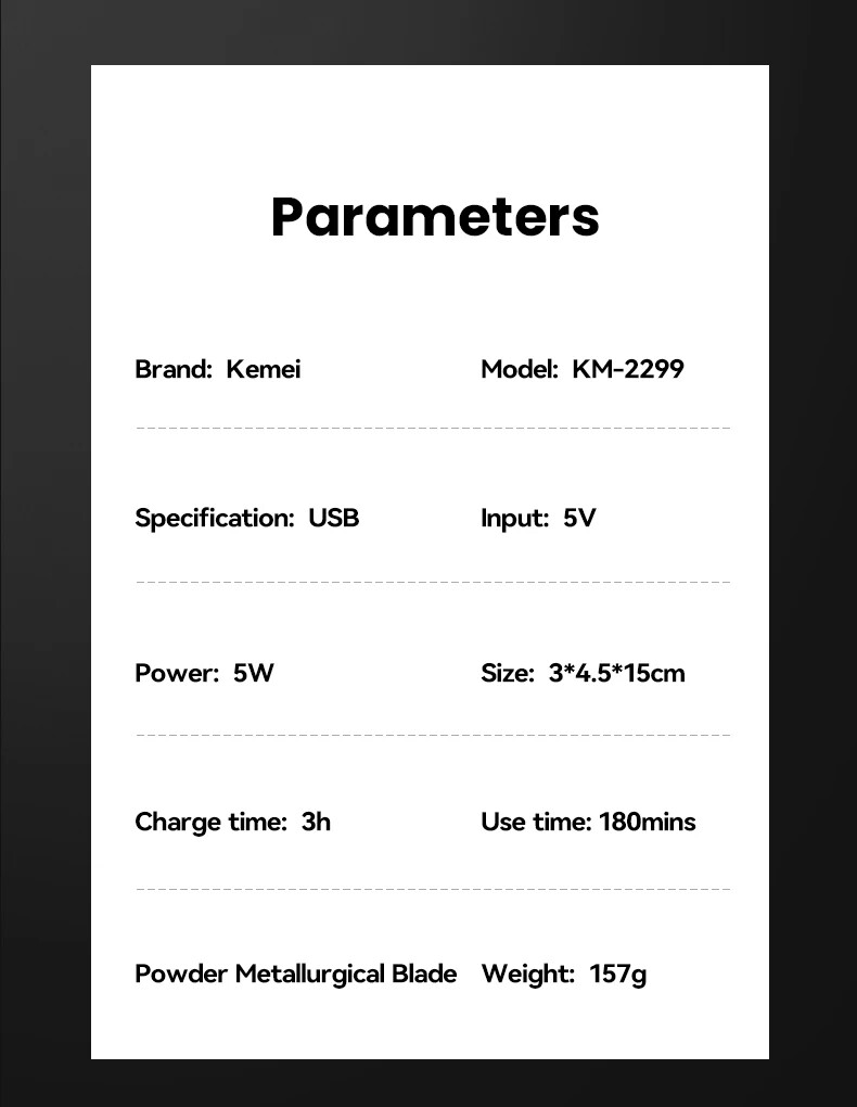 برای بررسی دقیق‌تر، جدول زیر خلاصه‌ای از مشخصات فنی Kemei KM-2299 را نشان می‌دهد: